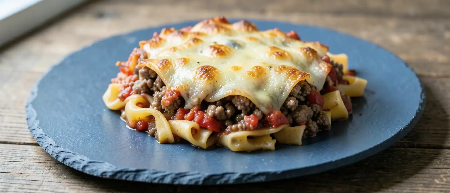 6.Eine Auflaufform mit Fett ausstreichen. Die Nudel-Hackfleisch-Mischung einfüllen und glatt streichen.