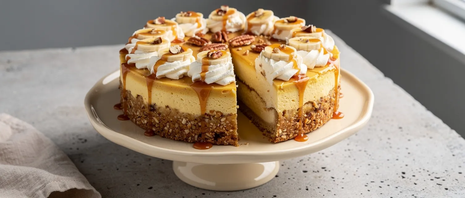 Ein himmlischer Bananen-Foster-Käsekuchen mit knusprigem Pekannussboden, cremiger Bananenfüllung und köstlicher Karamell-Rum-Sauce. Perfekt für besondere Anlässe.