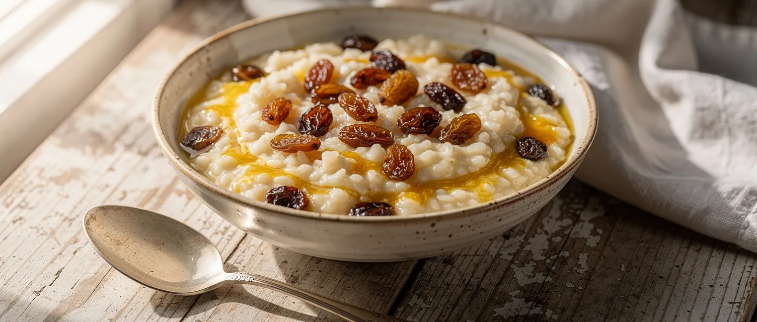 Ein cremiger Milchreis-Pudding aus braunem Reis und Sahne, verfeinert mit Rosinen und einem Hauch Zimt. Ein köstliches Dessert für die ganze Familie.