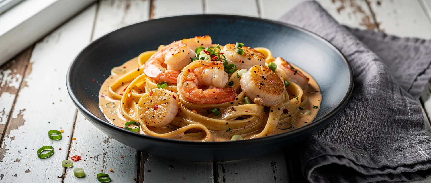 Dieses cremige Cajun Meeresfrüchte-Nudelgericht mit Garnelen und Jakobsmuscheln ist voller Geschmack und passt perfekt zu Fettuccine. Ein schnelles und herzhaftes Hauptgericht für Liebhaber würziger Küche.