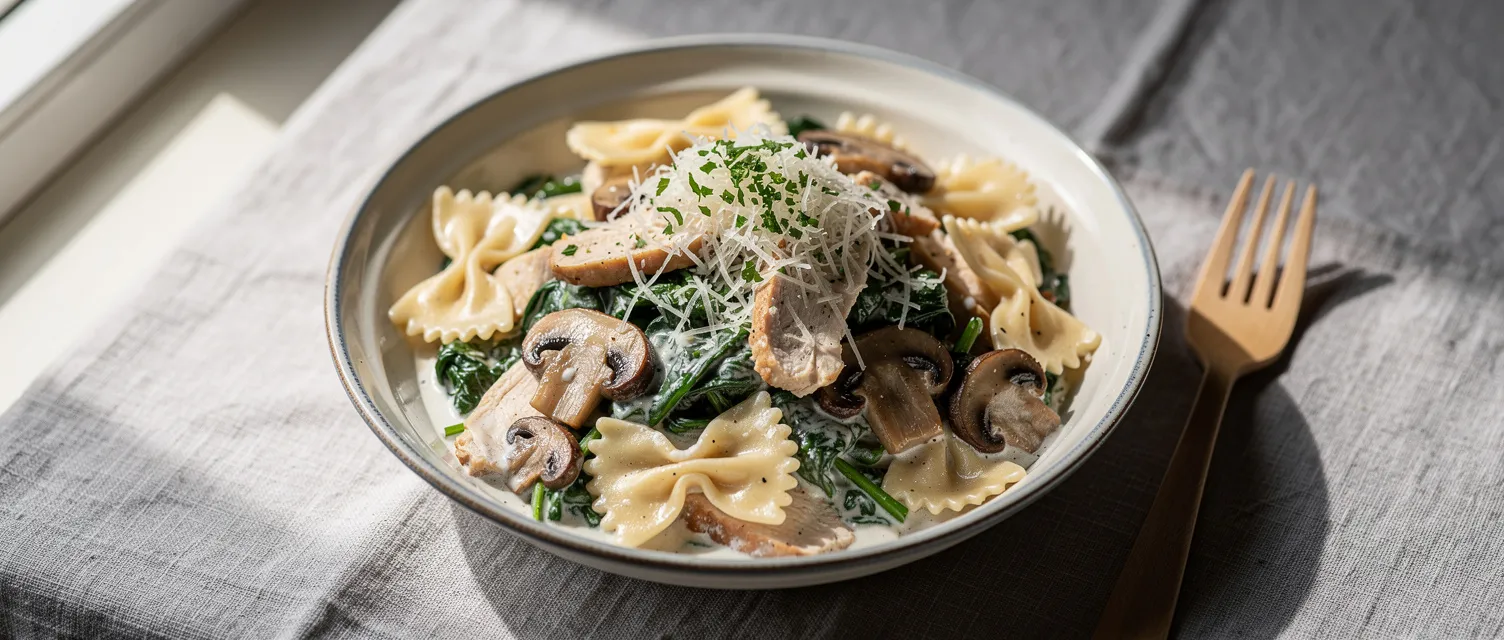 Cremige Hähnchen-Pilz-Spinat-Nudeln