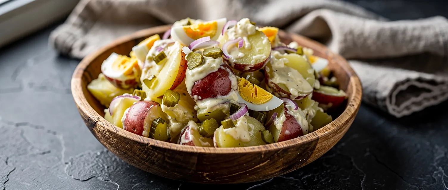 3. In einer großen Schüssel Mayonnaise, fein gehackte Essiggurken, gewürfelte hartgekochte Eier, gehackte rote Zwiebeln, gehackten Stangensellerie, Senf und Apfelessig gut verrühren. Mit Salz und Pfeffer abschmecken.