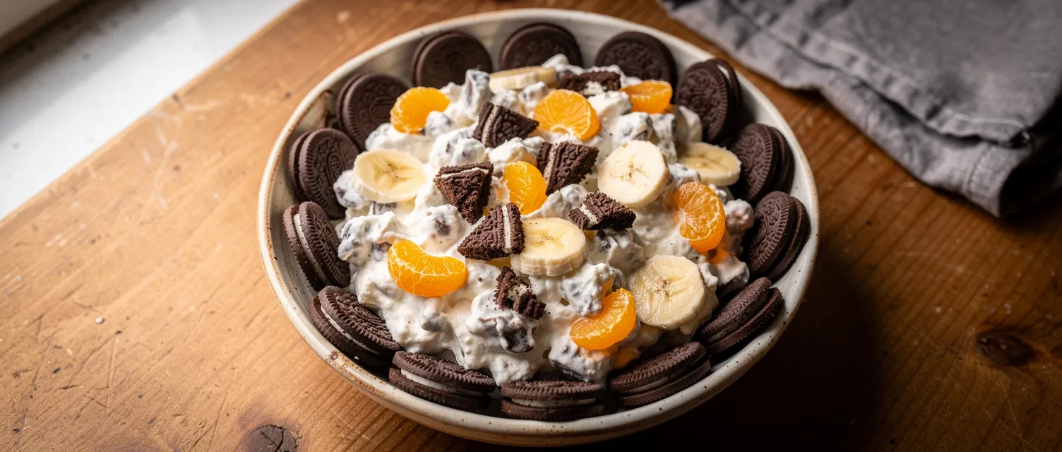 Dieser schnelle und einfache cremige Keks-Salat mit Schokostreifen-Keksen, Aufschlagcreme, Instant-Pudding, Mandarinen und Bananen ist ein beliebter Familiendessert, der ganz ohne Backen auskommt.