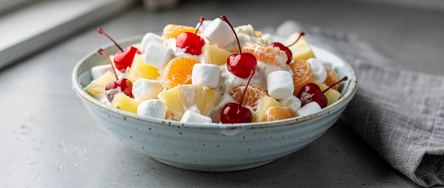 Dieser cremige Obstsalat kombiniert Ananas, Mandarinen, Maraschino-Kirschen und Mini-Marshmallows mit saurer Sahne. Perfekt als Nachtisch oder Beilage für festliche Anlässe.