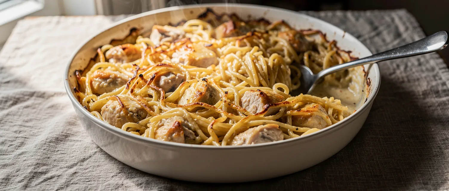 Ein wärmendes und sättigendes Gericht: Hähnchen in einer cremigen Sauerrahmsauce, serviert mit Eiernudeln. Ideal für die ganze Familie und dank bereits gegartem Hähnchen schnell zubereitet.