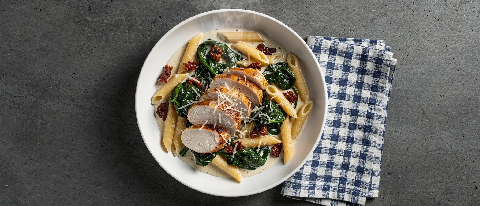 4. Sahne, Hühnerbrühe, Hartkäse, das restliche Knoblauchpulver und die italienische Gewürzmischung in die Pfanne geben. Bei mittlerer Hitze verquirlen, bis die Sauce anfängt einzudicken, etwa 3 Minuten. Spinat und getrocknete Tomaten hinzufügen; köcheln lassen, bis der Spinat zusammenfällt und die Sauce die gewünschte Konsistenz erreicht hat, weitere ca. 3 Minuten. Das Hähnchen zurück in die Pfanne geben und erhitzen.