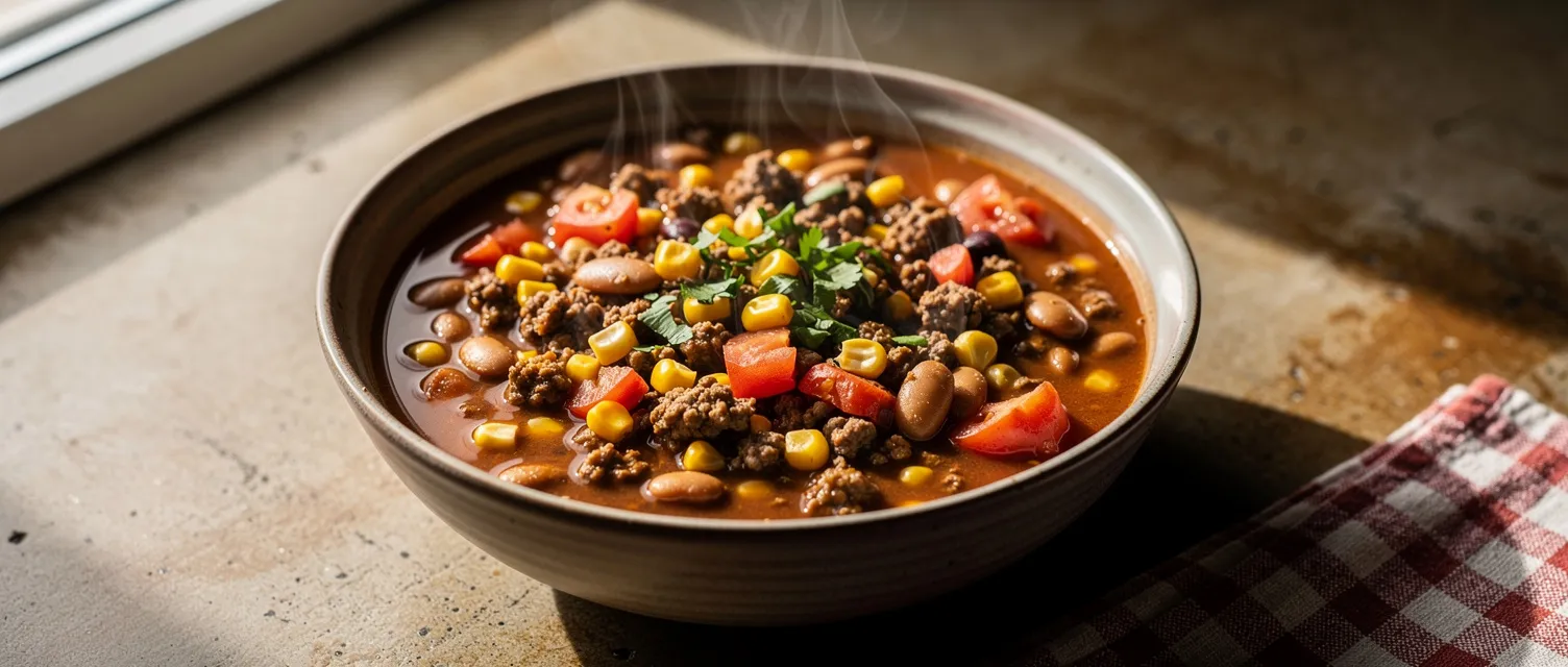 Dieser deftige Taco-Eintopf ist ein einfaches One-Pot-Gericht, das Rinderhackfleisch mit Tomaten, Zwiebeln, Bohnen und Mais kombiniert. Perfekt für ein schnelles und leckeres Hauptgericht.