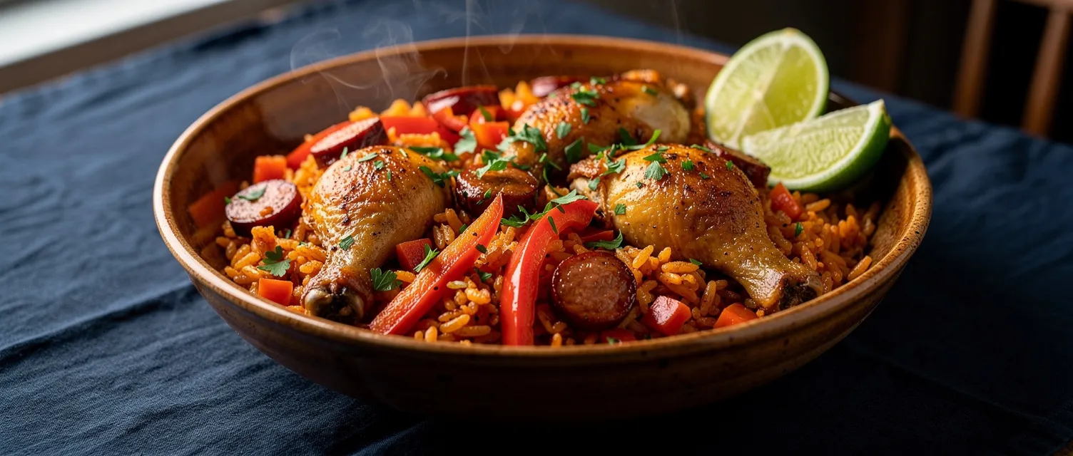 Ein deftiges Hähnchengericht mit Reis und Räucherwurst, das in einem Topf zubereitet wird. Perfekt für ein einfaches und sättigendes Abendessen nach New-Orleans-Art.