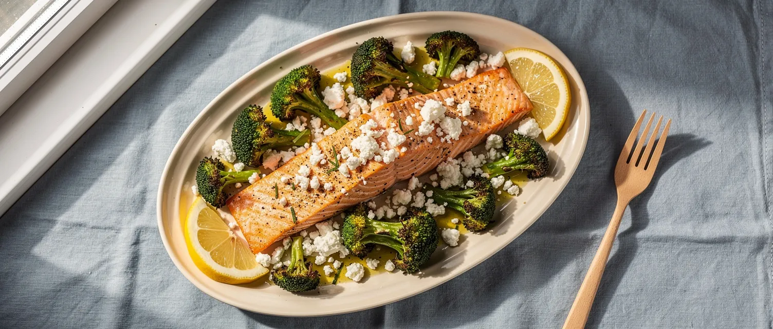 Dieses einfache Gericht mit Lachs und Brokkoli vom Backblech ist schnell zubereitet und perfekt für ein gesundes Abendessen. Gewürzt mit griechischen Kräutern und Honig-Senf, wird es mit Feta und Zitrone abgerundet.