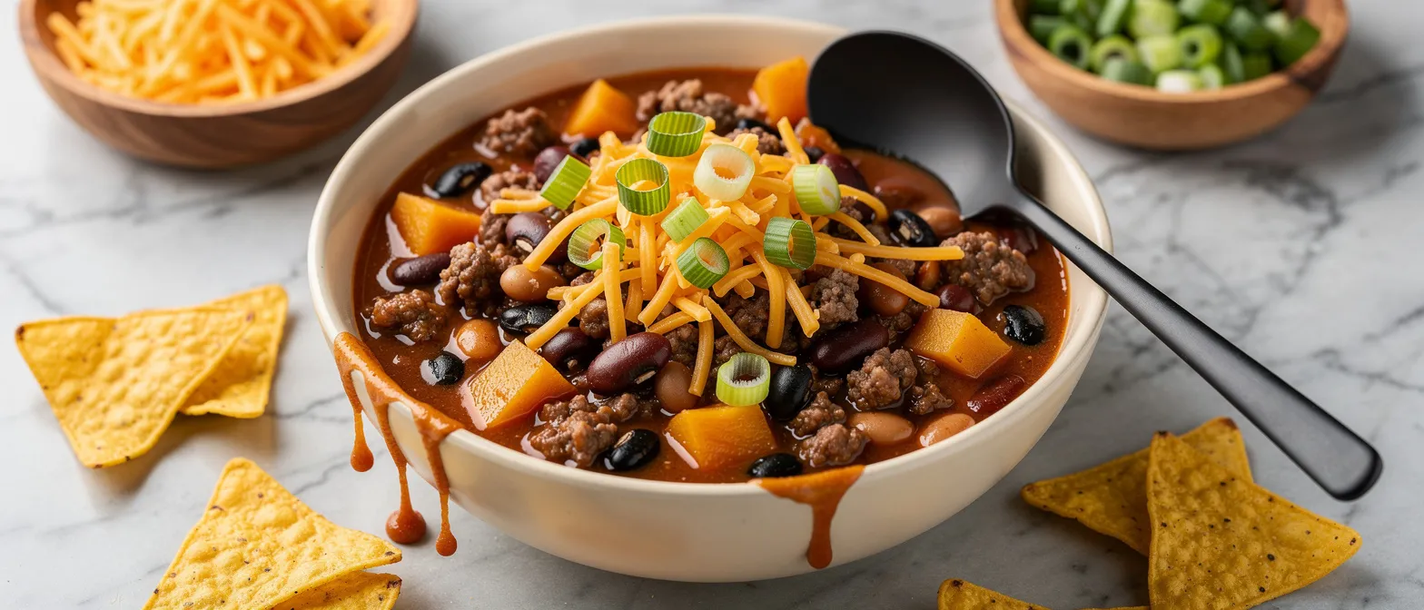 5. Nach 30 Minuten das Chili probieren und bei Bedarf mit Salz abschmecken. Heiß mit Ihren Lieblingsbeilagen (Sauerrahm, Käse, Frühlingszwiebeln, Mais-Chips usw.) servieren.