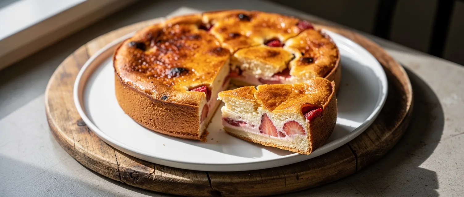 Ein klassischer Erdbeer-Crème-Brûlée-Kuchen mit einer süßen, cremigen Füllung, frischen Erdbeeren und einer knusprigen, karamellisierten Zuckerschicht. Ein perfektes Dessert für besondere Anlässe.
