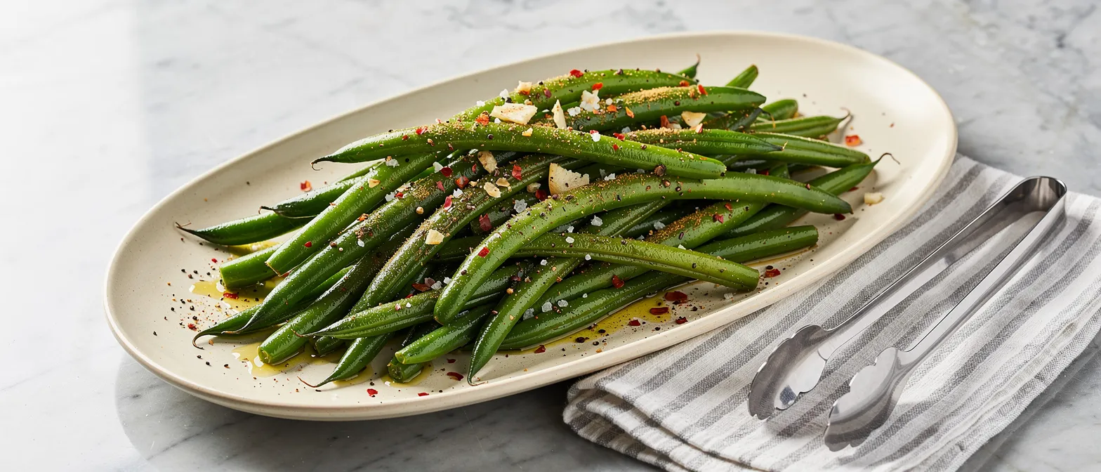 Servieren Sie diese gebratenen grünen Bohnen in weniger als 15 Minuten! Mit Knoblauch und Gewürzen verfeinert, sind sie eine köstliche Aufwertung zu einfachen Bohnen.