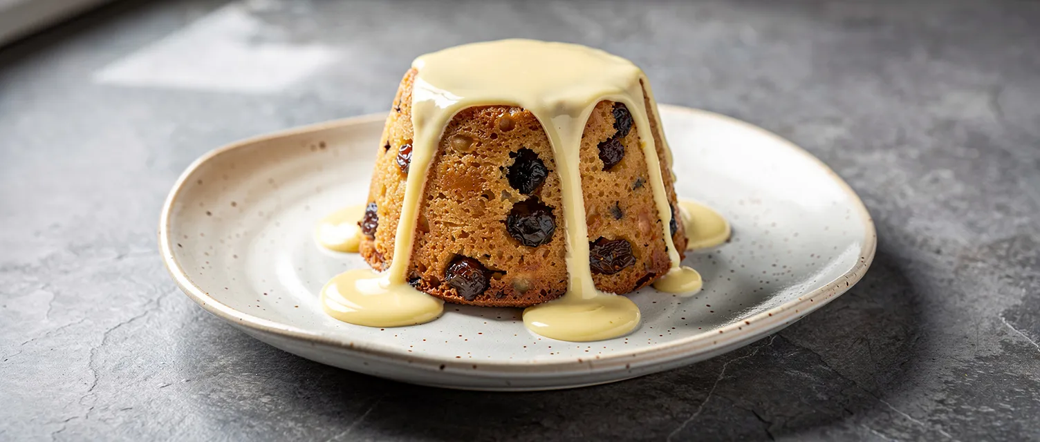 Ein traditioneller, gedämpfter Talgpudding mit Rosinen, Maissirup und Gewürzen, perfekt für die Weihnachtszeit. Serviert mit einer cremigen Vanillesauce ist dieser Pudding ein gemütlicher Abschluss für jedes Festmahl.