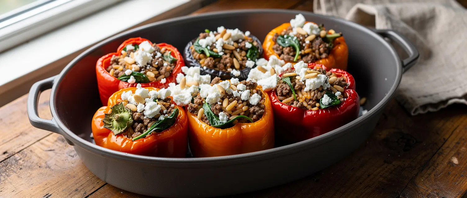 Entdecken Sie dieses köstliche Rezept für griechische gefüllte Paprika mit Orzo, Rinderhackfleisch, Spinat und Feta. Ein einfaches und sättigendes Hauptgericht, perfekt für die ganze Familie.