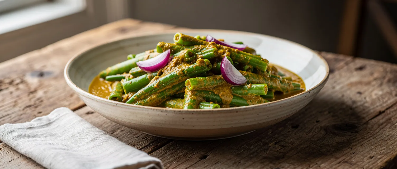 Ein aromatisches grünes Bohnen-Curry, zubereitet mit frischen Bohnen, Kokosmilch und einer Mischung aus exotischen Gewürzen. Perfekt als vegetarisches Hauptgericht oder als Beilage zu Reis.