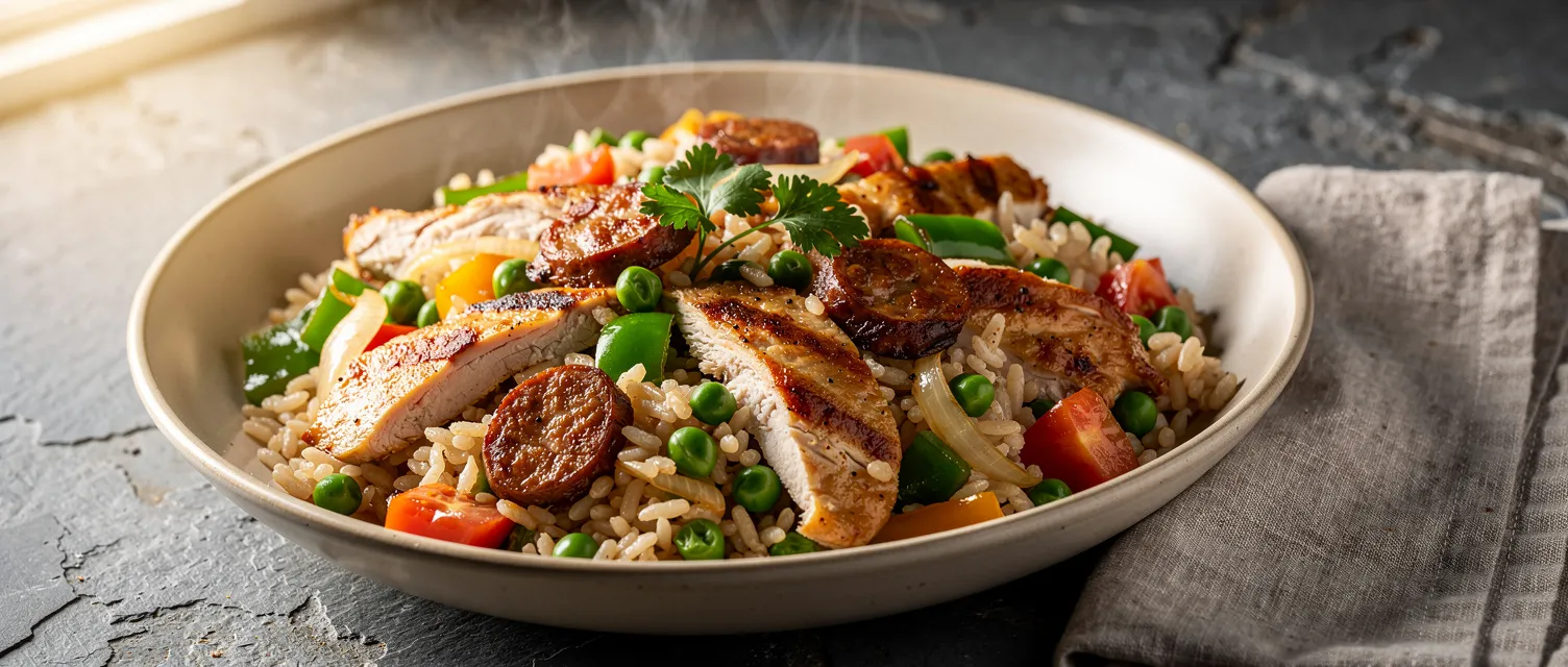 Ein schnelles und herzhaftes Gericht: Hähnchen-Wurst-Pfanne nach spanischer Art. Süße italienische Wurst und gewürfeltes Hähnchenbrustfilet schmoren mit Reis, Erbsen, Tomaten und Paprika in einer würzigen Sauce. Ideal für ein unkompliziertes Abendessen.