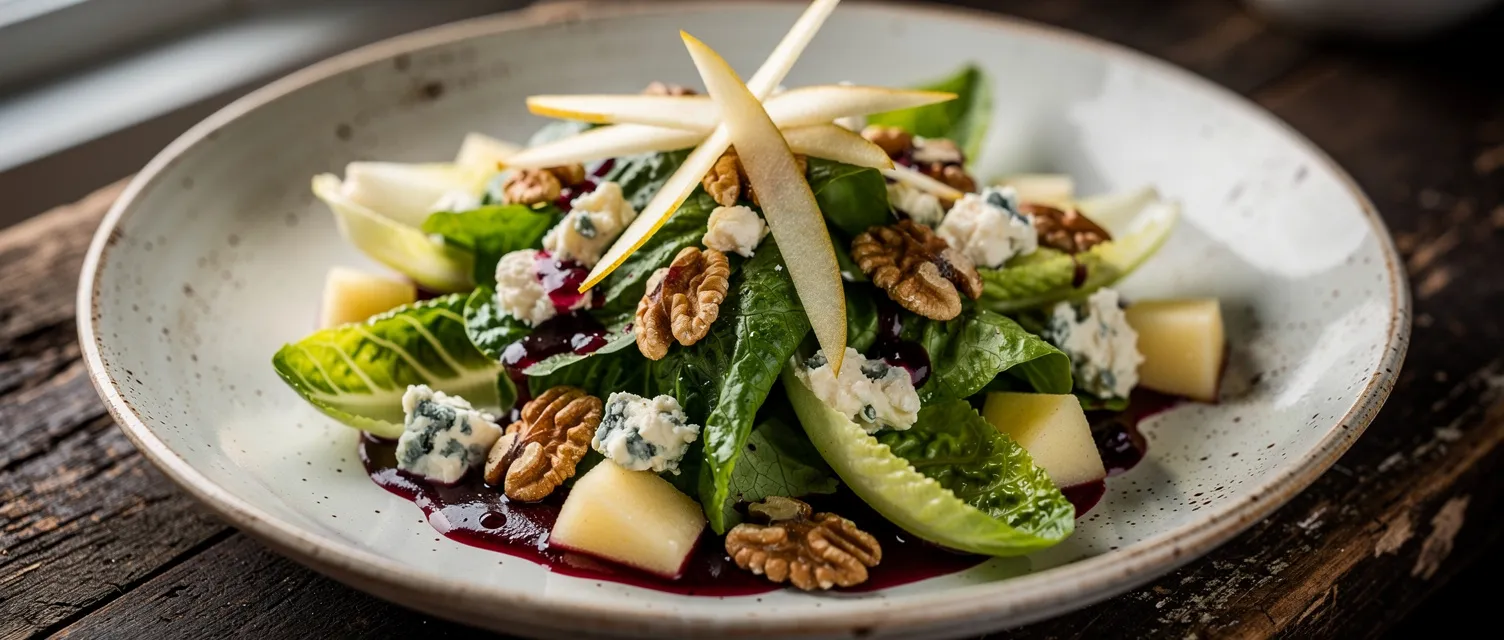 Ein frischer Herbstsalat mit knackigem Römersalat, Birnen, Walnüssen und Gorgonzola, abgerundet mit einer hausgemachten Preiselbeer-Vinaigrette. Ideal für die Feiertage oder als leichte Mahlzeit.
