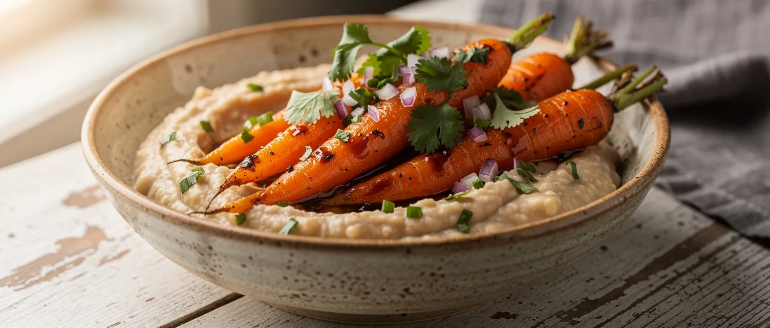 Süße Karotten treffen auf würzige Tamarinde in dieser eleganten Beilage oder vegetarischen Hauptspeise. Die Karotten werden mit Gewürzen geröstet und in einer süß-sauren Tamarinden-Glasur geschwenkt, serviert auf einem Knoblauch-Bohnen-Püree.
