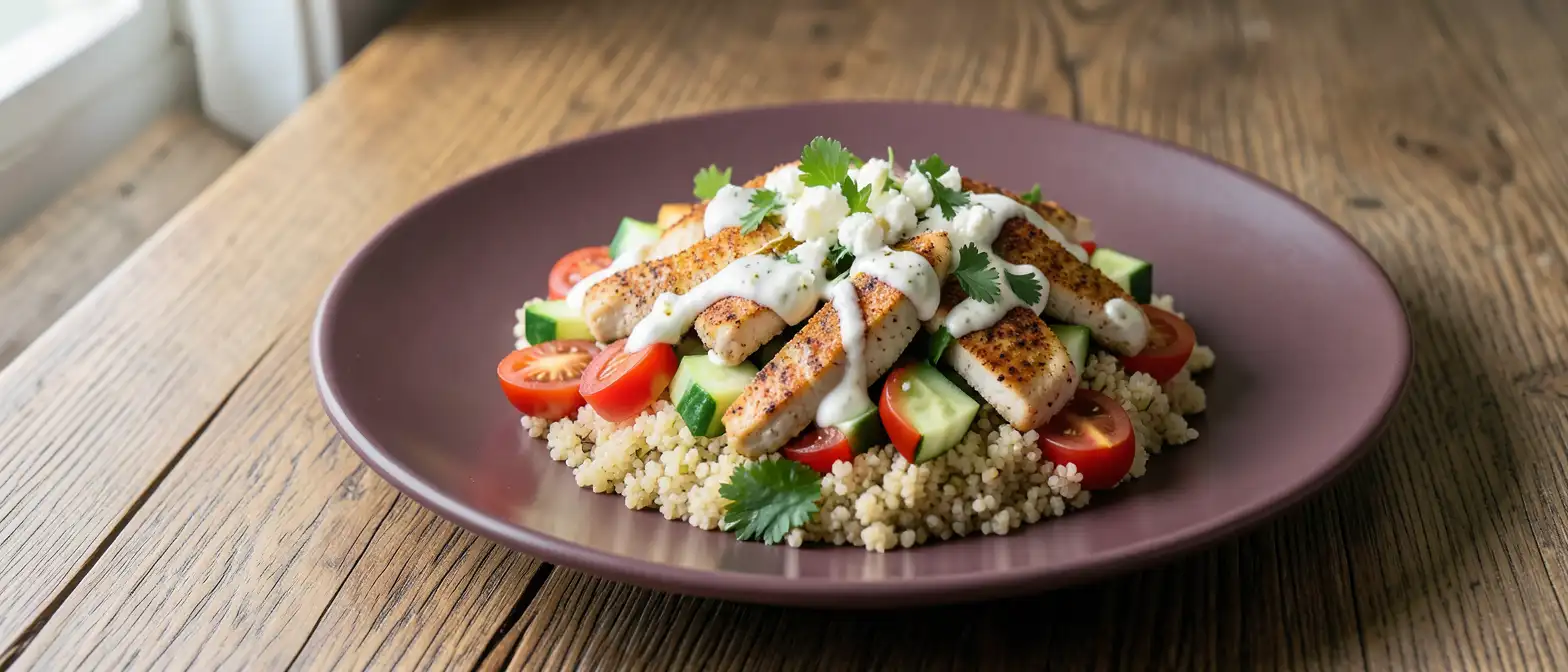5.Basis unten in die Boxen geben. Proteinquelle darauf verteilen. Gemüse, und Kräuter darüber geben. Feta zerbröseln. Dressing separat mitnehmen oder direkt unterheben.