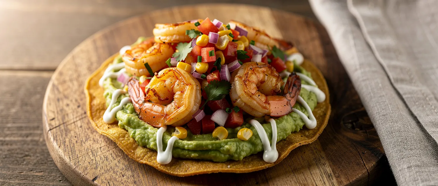Diese mexikanischen Garnelen-Tostadas bieten eine explosive Kombination aus süßen, sauren und scharfen Aromen. Knusprige Maistortillas werden mit cremigem Avocado-Aufstrich und pikanten Teufelsgarnelen belegt.