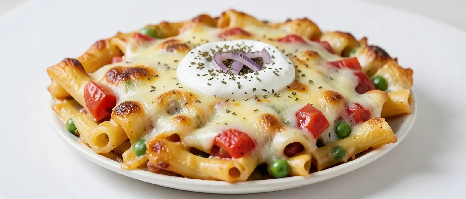 1.Die Rigatoni, TK-Erbsen und gewürfelten Tomaten in eine Auflaufform geben und vermengen.