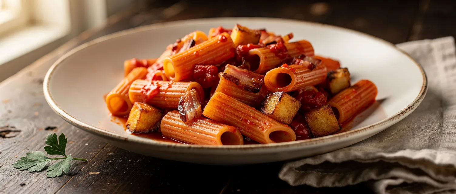 4. Währenddessen den Weißwein zum Guanciale-Fett im Topf geben. Bei mittlerer bis hoher Hitze etwa 1 Minute kochen lassen. Die Tomatensauce und den Pfeffer einrühren und zum Köcheln bringen.