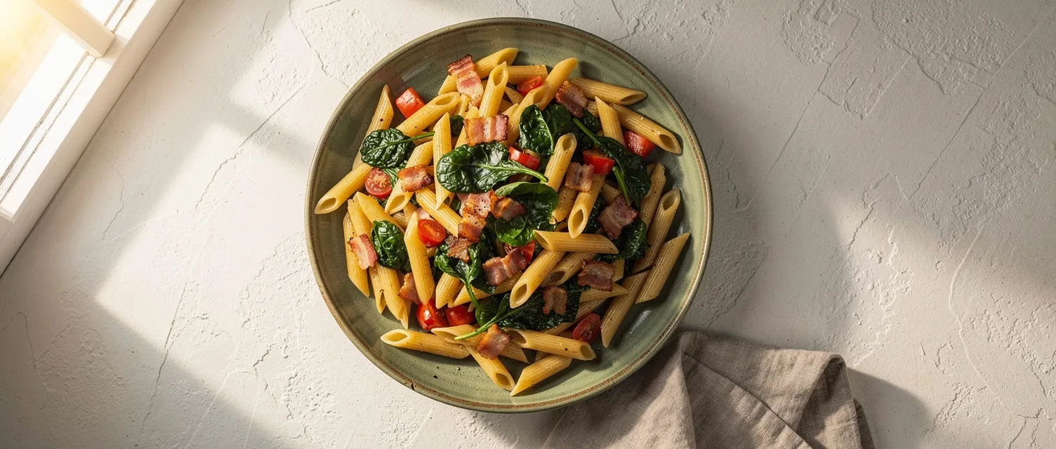 Dieses Rezept für Penne mit Spinat und Speck ist ein schnelles und leichtes Gericht, perfekt für jede Jahreszeit. Die Pasta wird mit zartem Spinat, knusprigem Speck und saftigen Tomaten kombiniert.