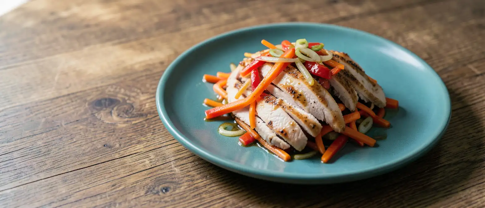 1.Fleisch mit etwas Salz und Pfeffer würzen und in einer Pfanne mit heißem Öl anbraten. Karotte, Frühlingszwiebeln und Paprika in Scheiben/Streifen schneiden. Gemüse zugeben und 3-5 Min. bei mittlerer Hitze mitbraten.