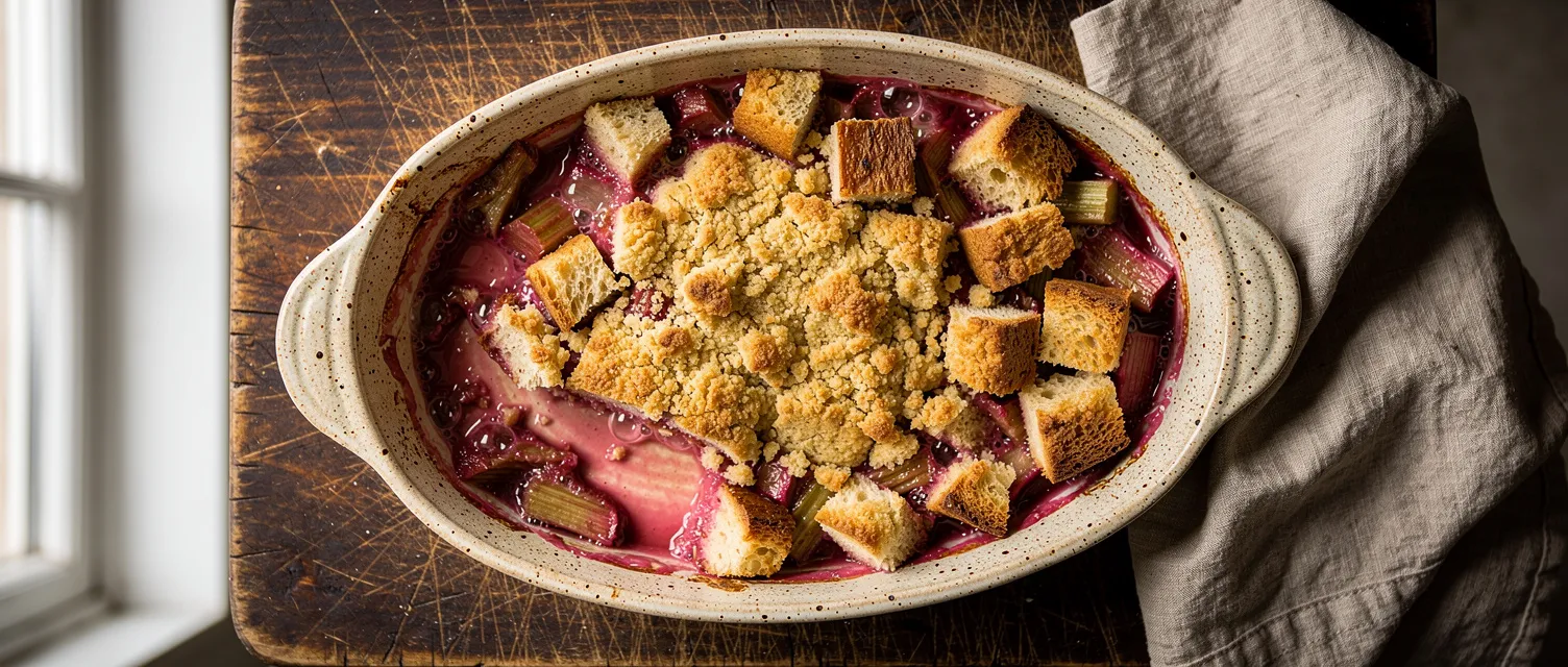 Ein einfaches Rhabarber-Auflauf-Rezept aus Omas Rezeptsammlung. Süßer Rhabarber mit knusprigen Brotwürfeln, perfekt als Dessert oder süße Hauptspeise.