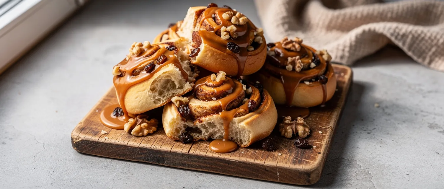 3. Nach Beendigung des Teigprogramms den Teig auf eine leicht bemehlte Arbeitsfläche geben und zu einem Rechteck von etwa 25x38 cm ausrollen. Den Teig mit geschmolzener Butter bestreichen und mit braunem Zucker, Zimt, Nüssen und Rosinen bestreuen.