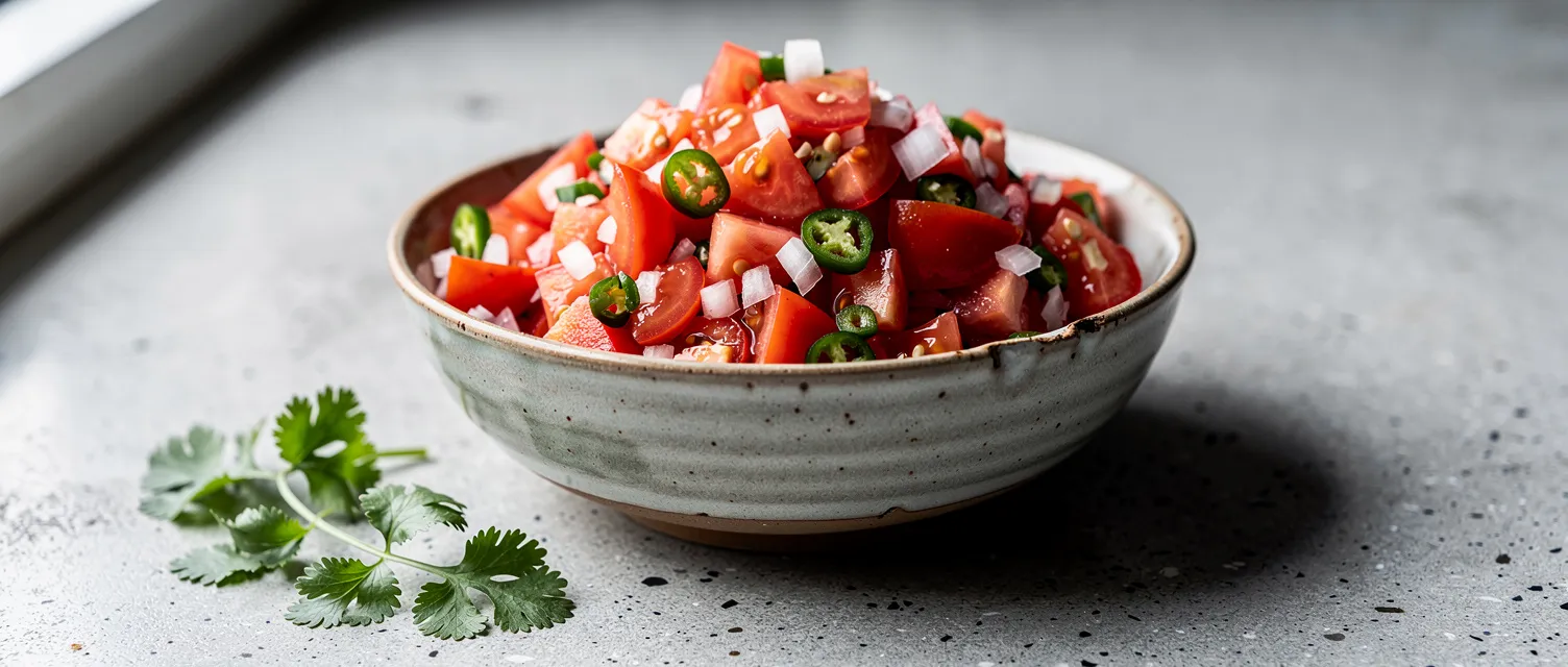 Diese schnelle und einfache Salsa wird aus frischen Tomaten, Zwiebeln und grünen Chilischoten zubereitet und ist perfekt als Vorspeise oder Dip. Mit nur wenigen Zutaten ist sie im Handumdrehen fertig.