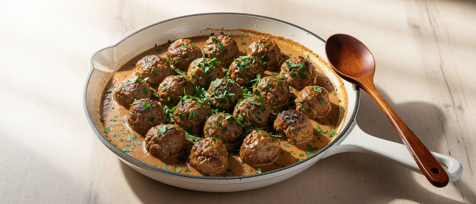 10. Die Fleischbällchen zurück in die Pfanne geben und in der Sauce wenden. Die Fleischbällchen bei niedriger Hitze unter gelegentlichem Rühren etwa 5 Minuten lang erhitzen, bis sie durchgewärmt sind.