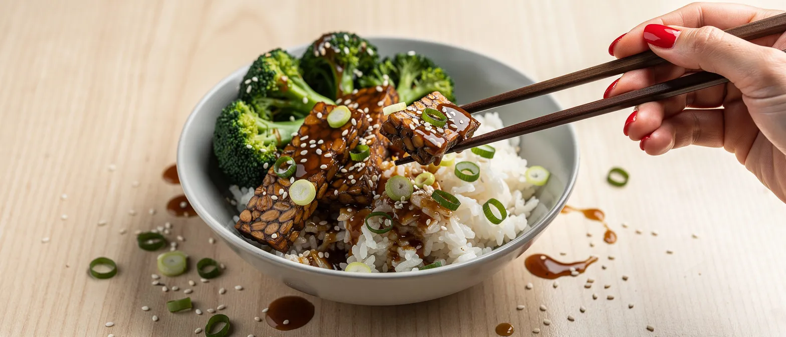 5. Zum Anrichten der Bowls jeweils 175 g Reis in eine Schale geben, mit einem Viertel des Sesam-Tempeh, einem Viertel der Brokkoliröschen und etwas Frühlingszwiebeln bestreuen.