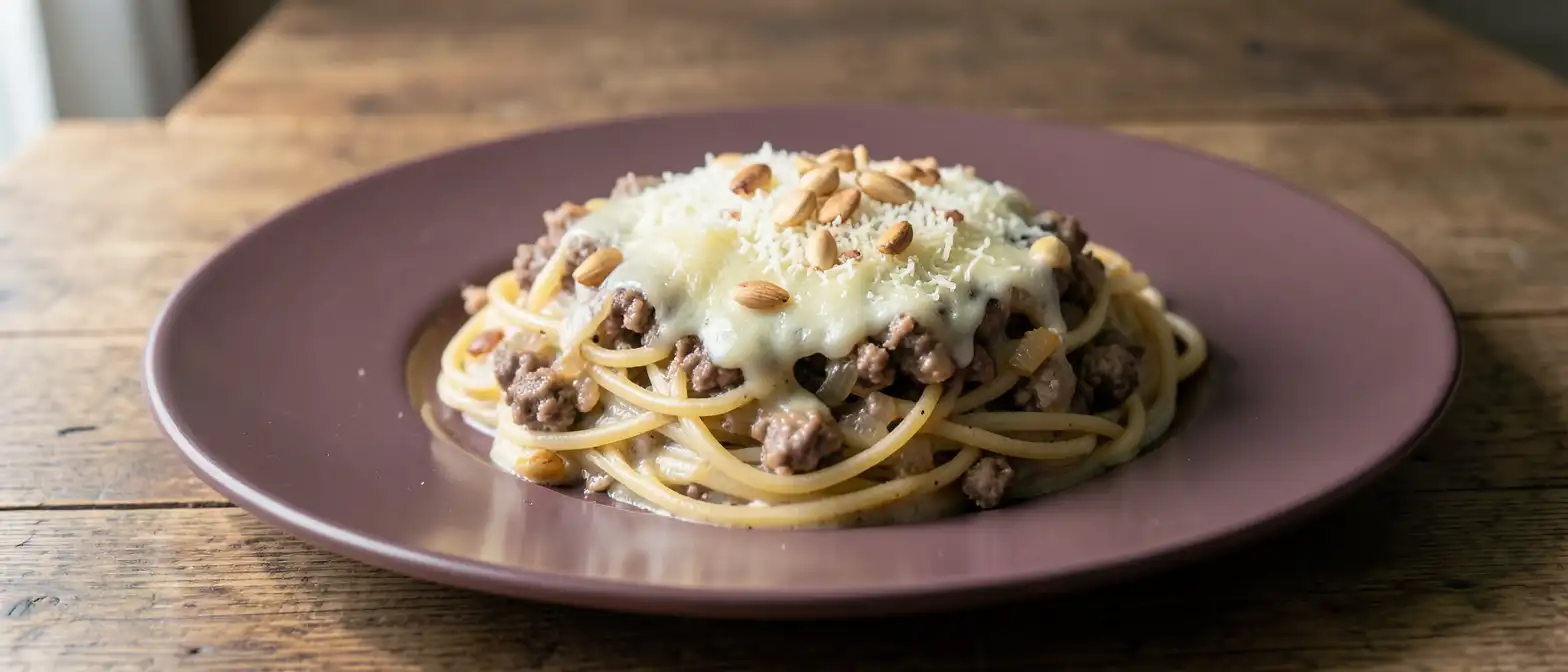 5.Eine eingefettete Backform wird mit abwechselnden Schichten von Spaghetti, Fleischmischung und Béchamel Sauce gefüllt. Das Ganze wird mit geriebenem Käse bestreut und bei 175°C für 30-45 Minuten gebacken. Auf Wunsch kann das Gericht mit Pilzen verfeinert werden.