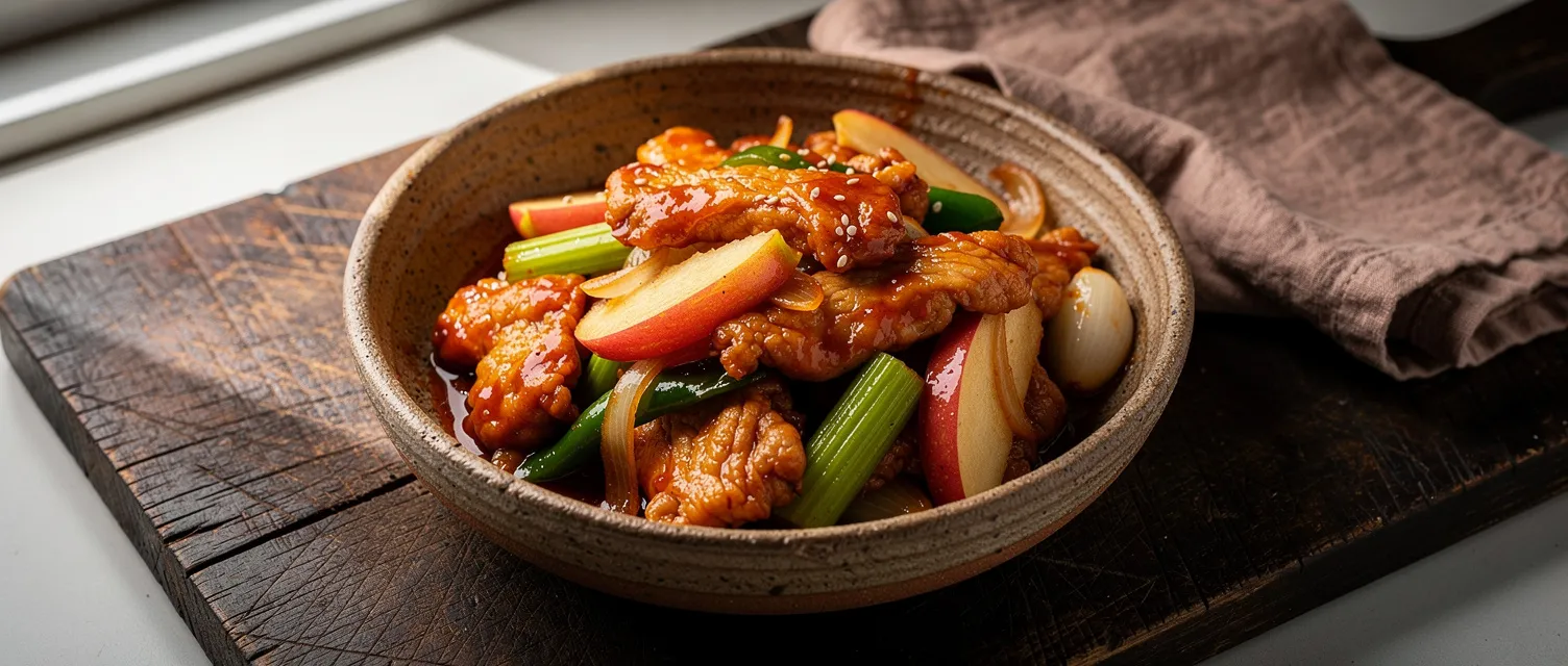 Dieses einfache Gericht kombiniert die Süße von Äpfeln mit der Würze koreanischer Chilipaste. Zarte Hähnchenstreifen werden mit frischem Gemüse und einer aromatischen Sauce zubereitet, ideal für ein schnelles Abendessen.