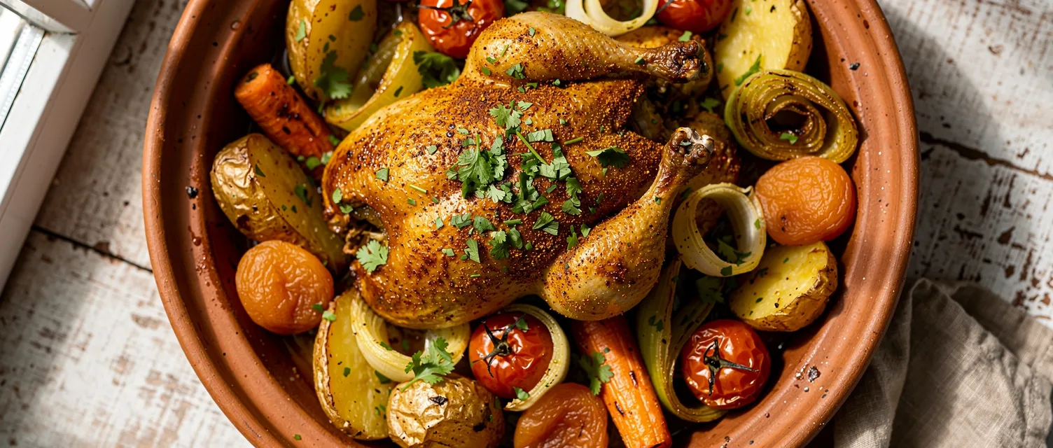 5. Die getrockneten Aprikosen, die in 2,5 cm dicke Scheiben geschnittenen Kartoffeln und die Cherrytomaten um die Wachtel herum anordnen, sodass die Wachtel unbedeckt bleibt. Alle Zutaten mit Loomi Aswad bestreuen.
