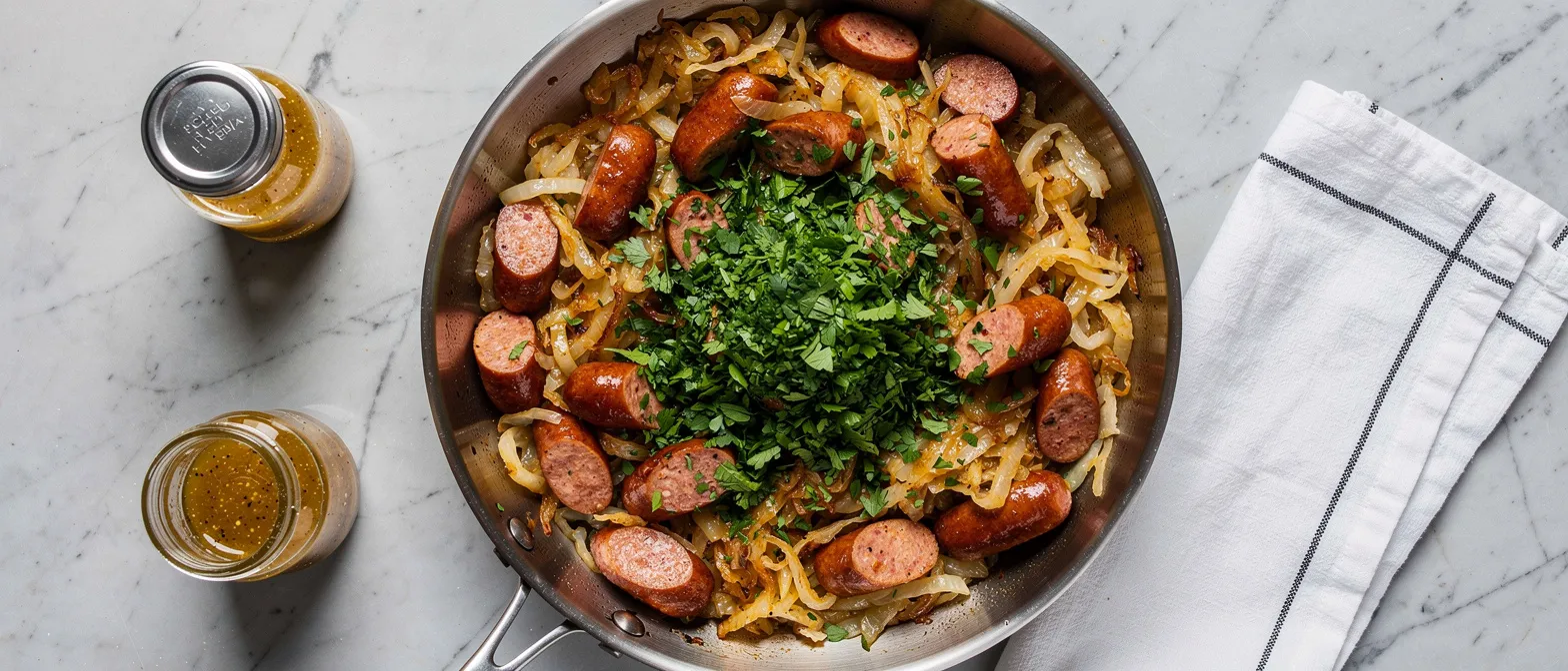 4. Sobald der Kohl zart ist, die Senf-Vinaigrette darüberträufeln, beginnend mit der Hälfte der zubereiteten Menge. Umrühren, damit die Kielbasa und der Kohl mit der Vinaigrette überzogen sind, probieren und bei Bedarf mehr hinzufügen. Warm servieren.